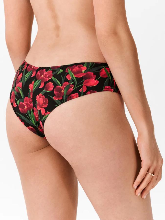 Женские купальные трусы-боксеры с принтом изготовлены из плотной эластичной ткани, которая быстро сохнет и прекрасно сохраняет форму. Все срезы обработаны эластичной резинкой для плотного прилегания к фигуре и комфортного ношения. V-образный вырез переда подчеркивает красивые линии фигуры и акцентирует внимание на линии талии. Черные купальные плавки украшены ярким принтом алых тюльпанов, которые создают запоминающийся пляжный образ. Дополните плавки купальным лифом с тех же принтом (31204770119), чтобы собрать стильный раздельный купальник для пляжа или бассейна. <br />