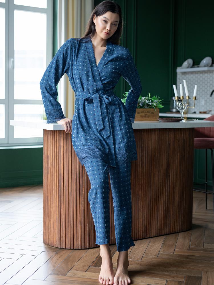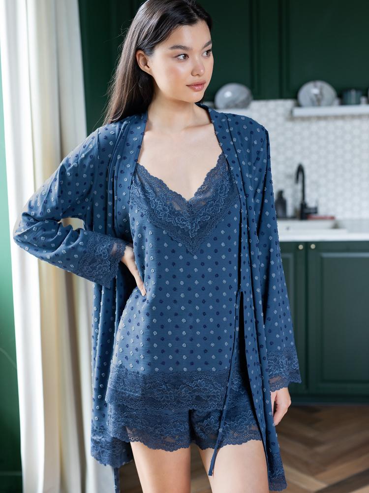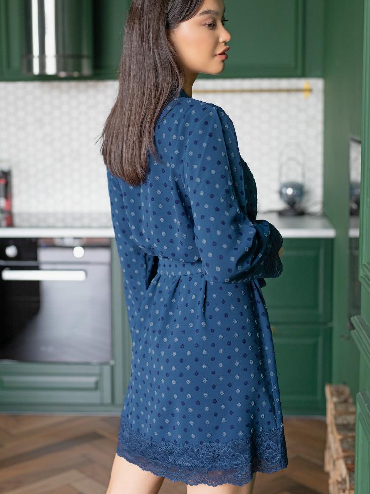 Женский домашний халат-кардиган. Выполнен из ткани цвета деним с вышивкой «горошки» в оттенках синего, украшен по подолу и низу рукавов широким кружевом в тон основной ткани. Халат "на запАх", поддерживается поясом и внутренней завязкой. Длина халата выше колена, что позволяет его носить как с пижамой M-145/P-129, так и с брюками Р-121, создавая красивый домашний комплект. Халатик хорошо держит форму, почти не мнется. Спокойные оттенки синего цвета создадут приятную атмосферу для релакса.