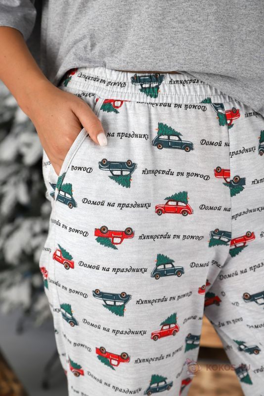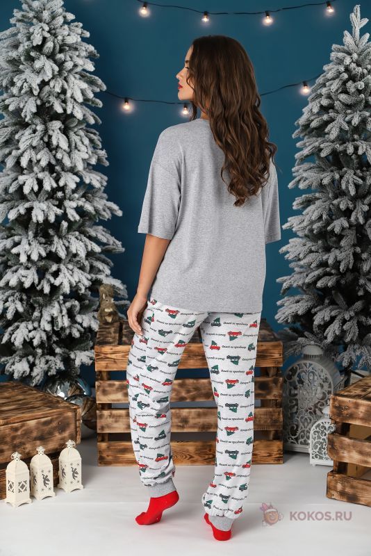 Костюм женский из трикотажного полотна "кулирка" в сочетании двух видов: гладкокрашеного меланжированного и с набивным рисунком, состоящий из футболки и брюк. Футболка - из гладкокрашеного полотнапрямого силуэта , модного покроя (укороченная и расширенная ), с короткими втачными рукавами, горловиной овальной формы, обработанной втачной бейкой, и принтом на полочке. Брюки - из полотна с набивным рисунком, на притачном поясе с эластичной тесьмой внутри, карманами в боковых швах и притачными манжетами, выполненными из отделочного полотна "рибана"