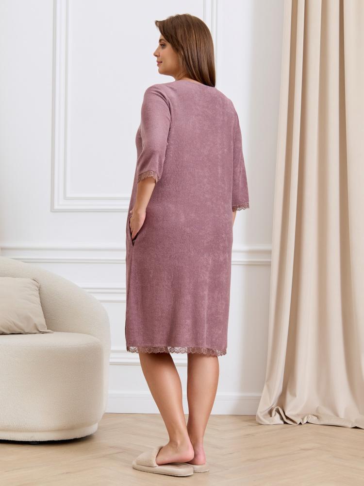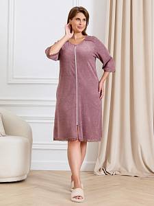 Халат женский из гладкокрашенного трикотажного махрового полотна, прямого силуэта, с горловиной овальной формы, втачными рукавами длиной ¾ длины, карманами в боковых швах и центральной бортовой застежкой на тесьму «молния». Полочка – с двумя небольшими косыми кокетками с кружевом в швах соединения кокеток с основными деталями, на левой полочке выполнена вышивка. Нижние срезы рукавов и нижние срезы изделия обработаны кружевом, в боковых швах разрезы.