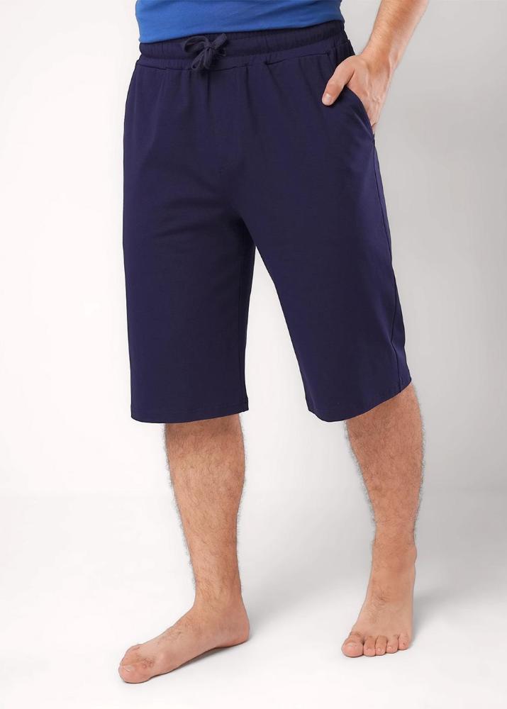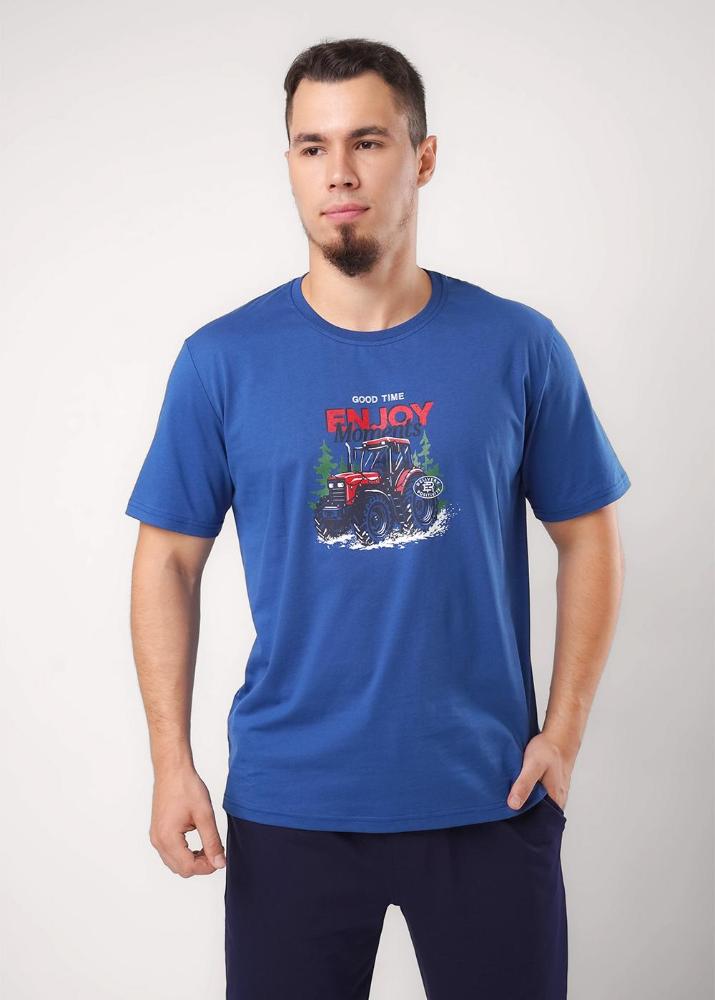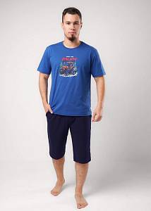 Мужская пижама из футболки и шорт выполнена из хлопковой кулирной глади. Футболка с круглой горловиной и коротким рукавом украшена дизайнерским принтом. Шорты на эластичном поясе со шнуром дополнены функциональными карманами.