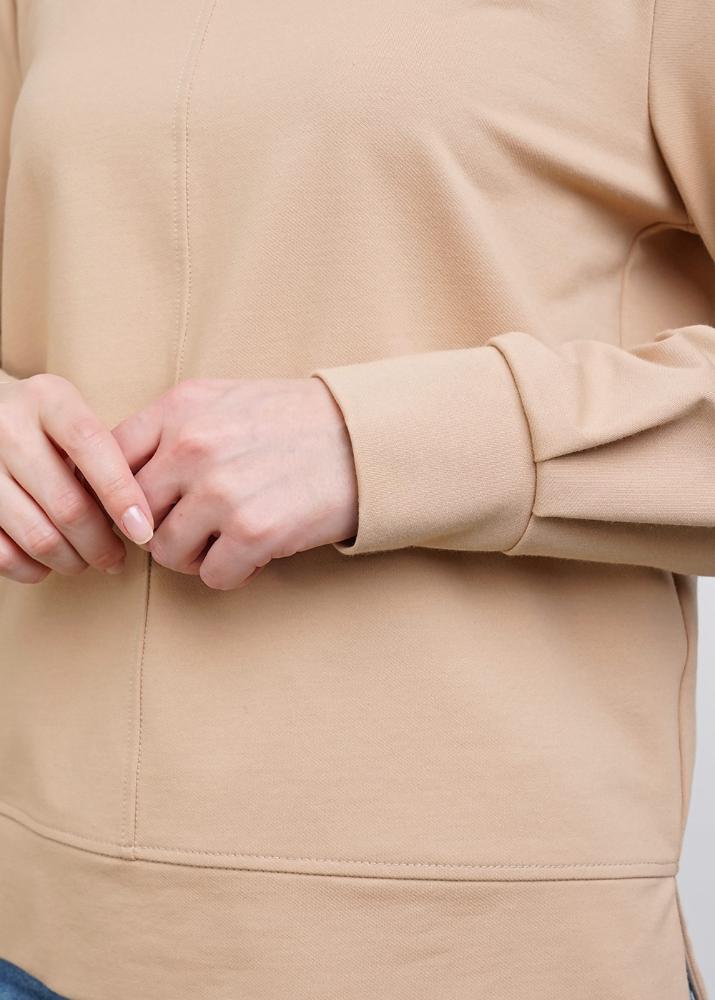Джемпер умеренного объёма из футера. Модель с втачным рукавом. По низу рукава манжета с двумя складками. По переду вертикальный шов. Горловина обработана обтачкой. По низу модели притачной пояс. По бокам разрезы. По переду принт. Перевод: Смысл. <br />