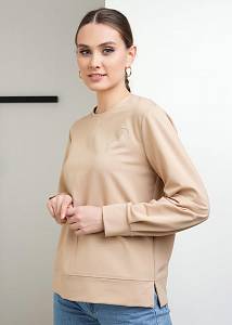 Джемпер умеренного объёма из футера. Модель с втачным рукавом. По низу рукава манжета с двумя складками. По переду вертикальный шов. Горловина обработана обтачкой. По низу модели притачной пояс. По бокам разрезы. По переду принт. Перевод: Смысл.
