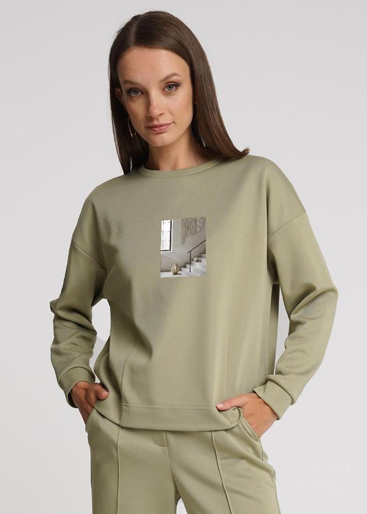 Джемпер, длинный рукав со спущенной линией плеча и манжетой внизу, округлый вырез горловины, на детали переда термоаппликация.