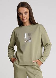 Джемпер, длинный рукав со спущенной линией плеча и манжетой внизу, округлый вырез горловины, на детали переда термоаппликация. <br />