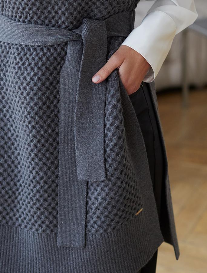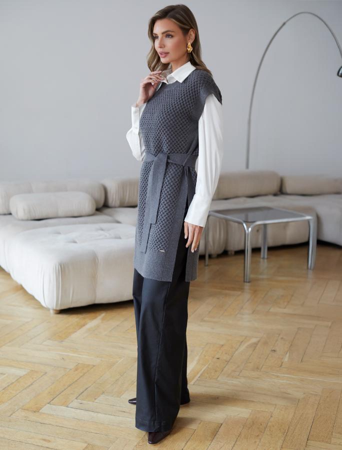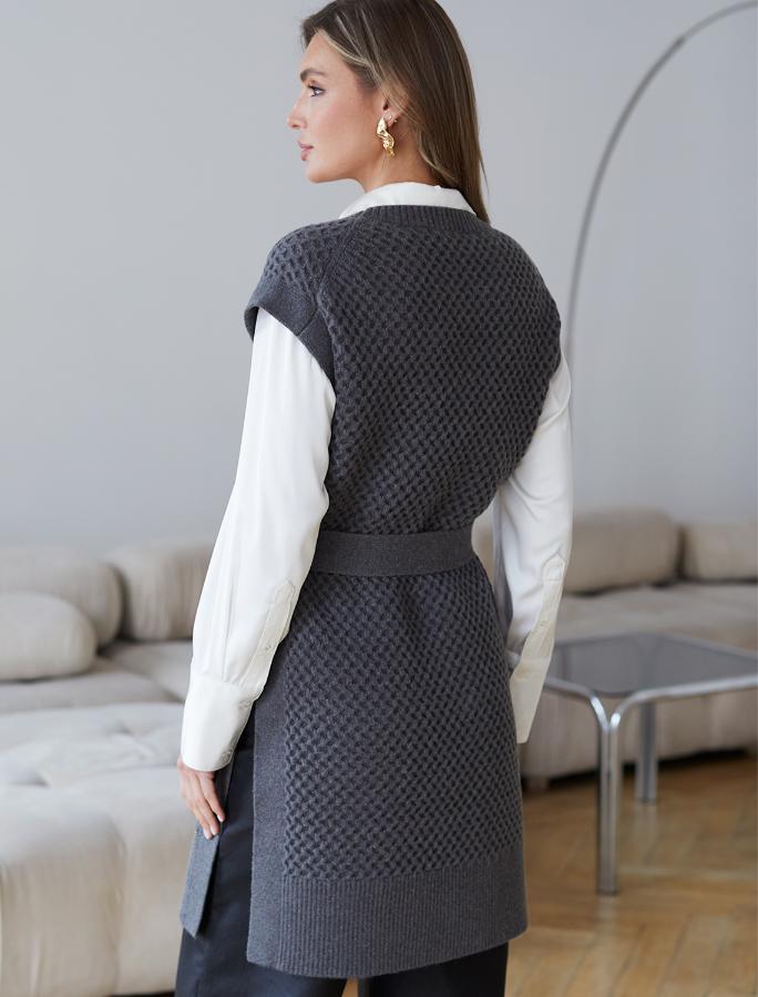 Удлиненный жилет выполнен из мягкой пряжи с кашемиром. Модель фактурной вязки дополнена высокими боковыми разрезами и поясом в тон изделия. Хорошо сочетается водолазками, лонгсливами и блузками. Мягкая пряжа очень приятная к телу, поддержит комфорт на протяжении всего дня, при этом не перегревая.
