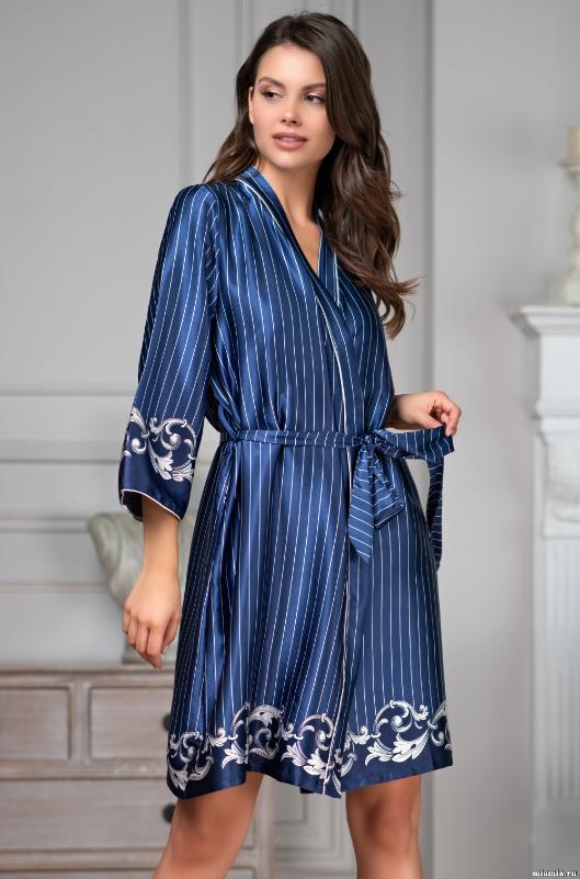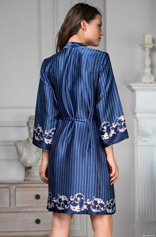 Короткий халат с рукавами длиной 3/4 Mia-Amore выполнен из искусственного шелка насыщенного синего цвета, принтованного оригинальным купонным рисунком в виде изящного барельефа по низу изделия и рукавов. Планка запашного халата на поясе и низ рукавов декорированы тонким белым кантиком. В боковых швах есть карманы.<br />