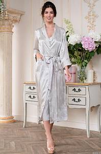 Длинный халат Mia-Amore с центральной застежкой на пуговицы выполнен из искусственного принтованного жаккардового полотна. Перед халата декорирован парой кармашков на уровне бедер. Воротник, рукава и карман декорированы тонким кантом. По талии ширина халата регулируется поясом.<br />