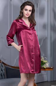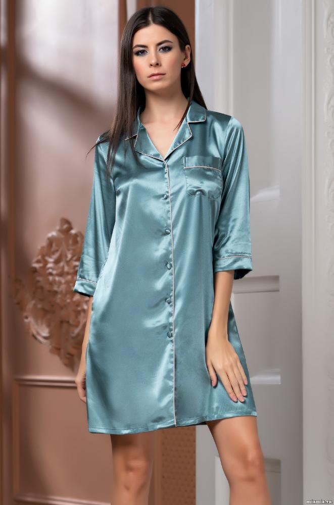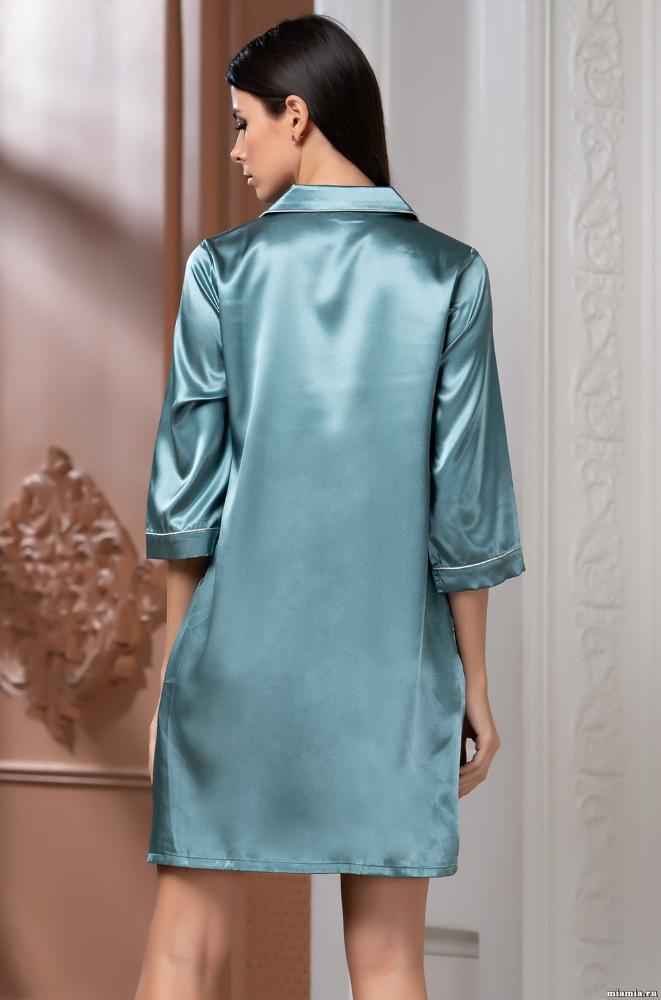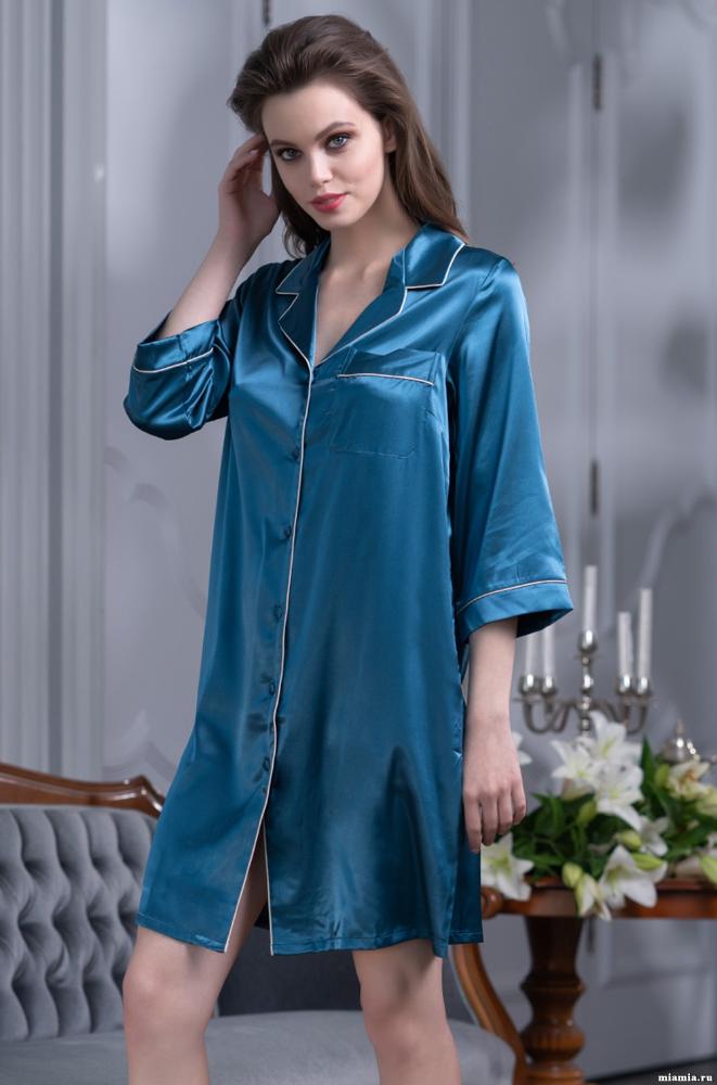 Рубашка Mia-Sofia с центральной застежкой на пуговицы на пуговицах с рукавами длиной 3/4, выполнена из искусственного шелкового полотна с атласным блеском. Низ рукавов, борт и воротник обработаны атласными кантами.