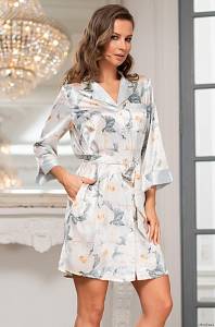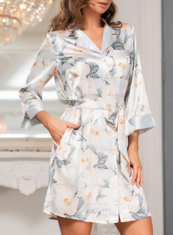 Рубашка Mia-Amore с рукавом длиной 3/4. Выполнена из принтованного атласа с однотонной отделкой и контрастными кантами. В боковых швах обработаны карманы. Линию талии можно подчеркнуть за счет пояса, который идет в комплекте.