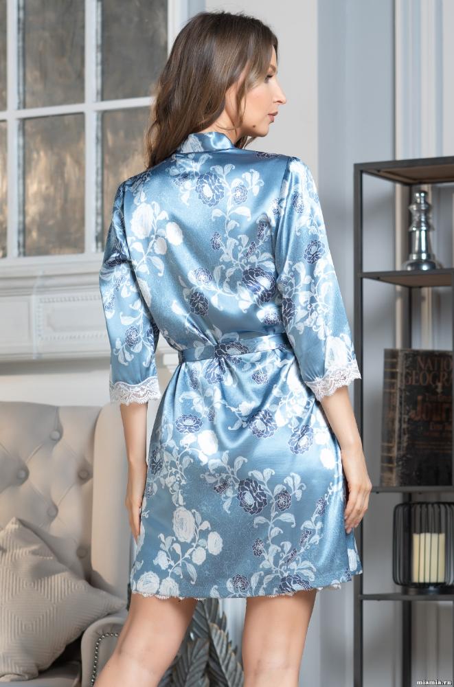 Короткий халат Mia-Amore с запахом, с рукавами длиной 3/4 выполнен из принтованного искусственного шелка. Планка халата отделана тонким кантом. По низу рукава оформлены ажурным кружевом. В боковых швах – карманы.<br />