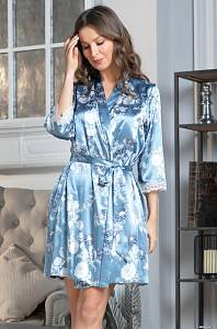 Короткий халат Mia-Amore с запахом, с рукавами длиной 3/4 выполнен из принтованного искусственного шелка. Планка халата отделана тонким кантом. По низу рукава оформлены ажурным кружевом. В боковых швах – карманы.