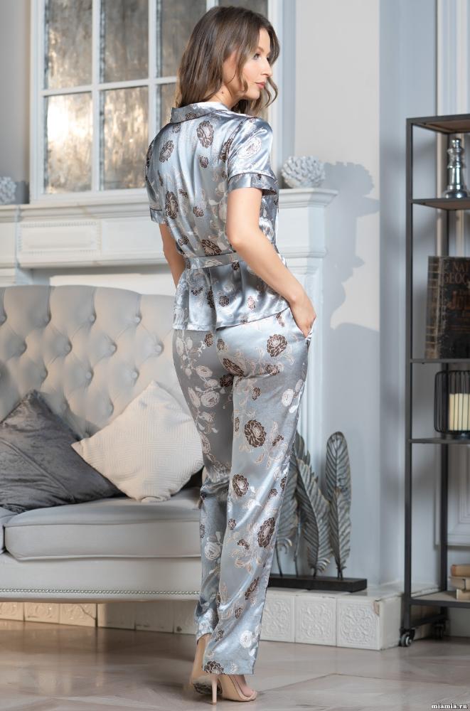 Комплект Mia-Amore состоит из рубашки с центральной застежкой на пуговицы с короткими рукавами и брюк. Комплект выполнен из искусственного принтованного шелка. Рубашки и брюки декорированы тонким кантом.<br />
