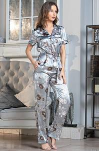 Комплект Mia-Amore состоит из рубашки с центральной застежкой на пуговицы с короткими рукавами и брюк. Комплект выполнен из искусственного принтованного шелка. Рубашки и брюки декорированы тонким кантом.