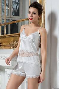 Комплект Mia-Amore состоит из топа и шорт, выполнен из искусственного шелка с жаккардовой основой. Вставка из ажурного кружева расположена по низу топа, узким кружевом обработан вырез топа и низ шорт. Декор - атласный цветок по центру выреза.