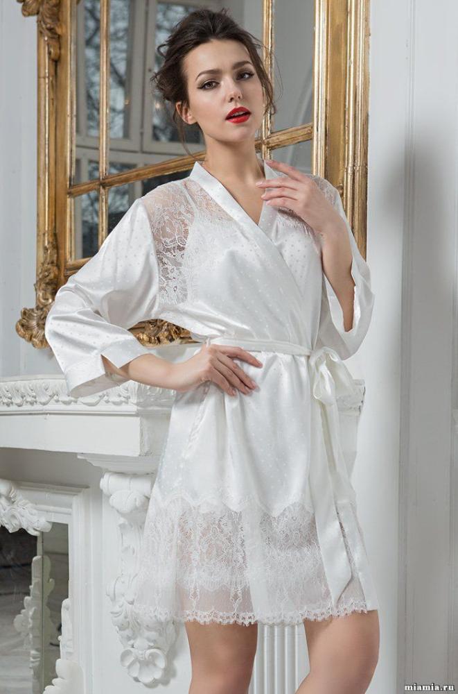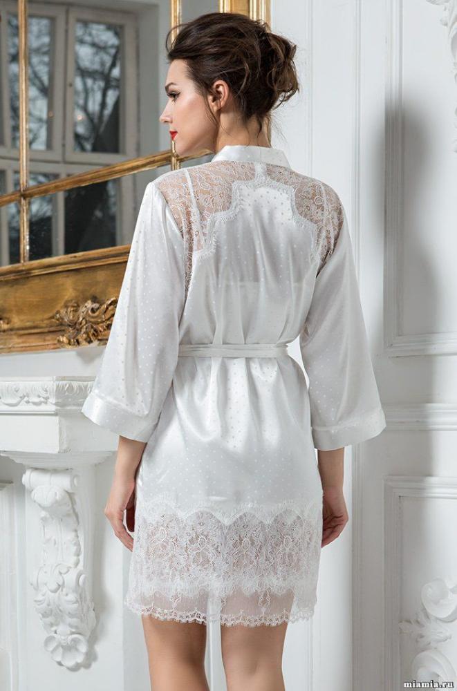 Короткий халат – кимоно Mia-Amore из искусственного шелка с жаккардовой основой. Вставки из ажурного кружева украшают верх и низ халата. По низу рукавов расположены небольшие разрезы. По бокам халата карманы.