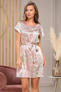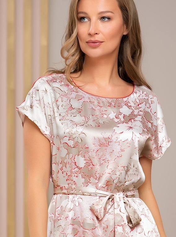 Туника Mia-Amore с коротким рукавом, свободного силуэта и длиной чуть выше колен, выполнена из принтованного искусственного шелка с блеском и дополнена контрастными кантами. По бокам расположены карманы. По низу туники обработаны разрезы. Линию талии можно подчеркнуть за счет пояса.