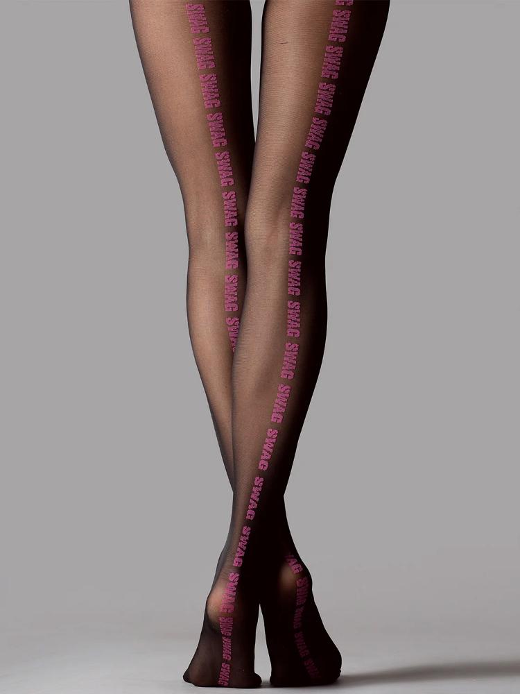 Прозрачные фантазийные колготки с оплетенным эластаном, плотностью 40 ден, с широким комфортным поясом, х/б ластовицей и усиленным плоским швом. Задняя часть ноги модели украшена ярко-розовой повторяющейся надписью "SWAG". Эластан, обкрученный полиамидом, обеспечивает хорошую растяжимость модели и придает ей мягкость. Колготки связаны на новейшем оборудовании, что гарантирует их перманентно высокое качество.