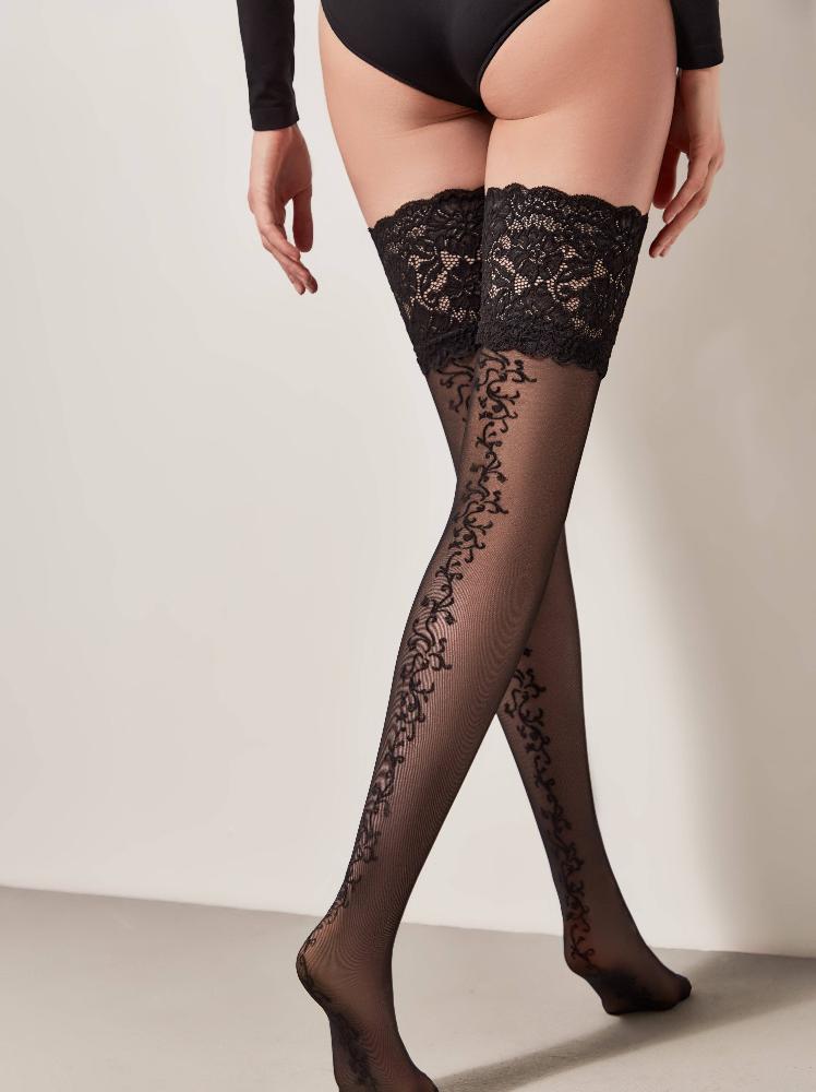 Тонкие чулки с цветочным рисунком сзади ноги и широкой ажурной резинкой – то, что нужно для стильных образов и абсолютной уверенности в себе. · 20 den · тонкие и эластичные · самоподдерживающаяся ажурная резинка · плотное облегание · цветочный рисунок сзади ноги · созданы для абсолютной уверенности в себе