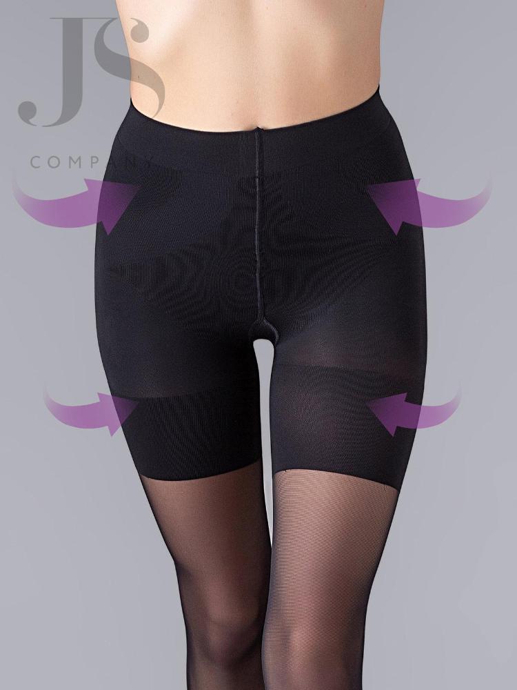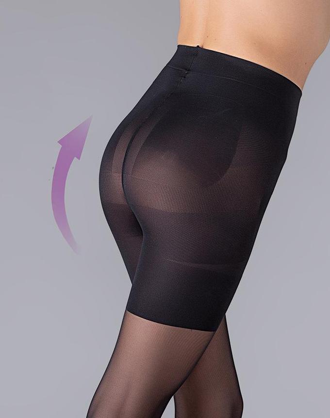 Полупрозрачные корректирующие колготки с оплетенным эластаном, плотностью 40 ден, со специальными высокими шортиками, которые формируют красивую форму ягодиц, великолепно приподнимают их, а также моделируют бедра, животик и бока, разглаживая складки. Колготки имеют полуматовую структуру, отлично облегают ножки, создавая ровную и гладкую поверхность. Изделие с комфортными швами, удобным поясом и гигиеничной ластовицей.
