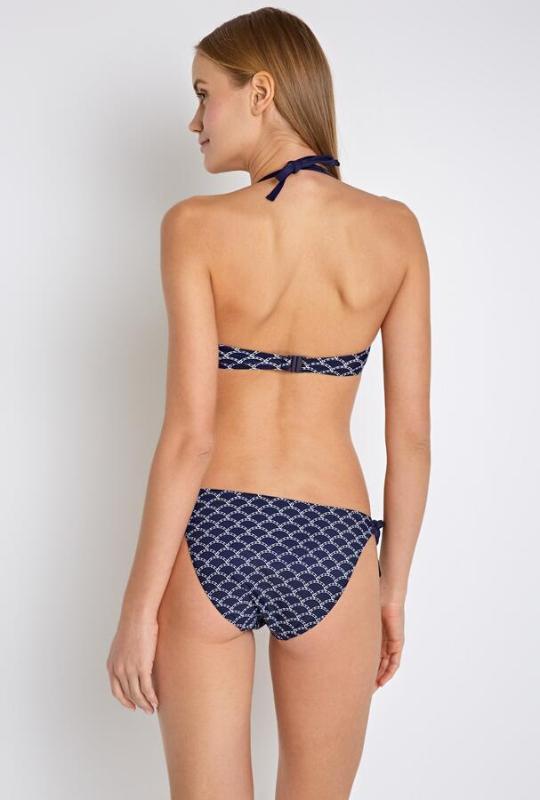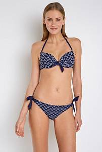 Купальник раздельный с контрастным набивным принтом. Бюстгальтер классической формы на косточках, с завязками на шее и декоративным узлом по центру. Формованные чашки с Push-up для размеров 70AB, 75ABC, 80B и без Push-up для размеров 70C, 75DE, 80CDE, 85BCD. Трусики с завязками по бокам.