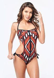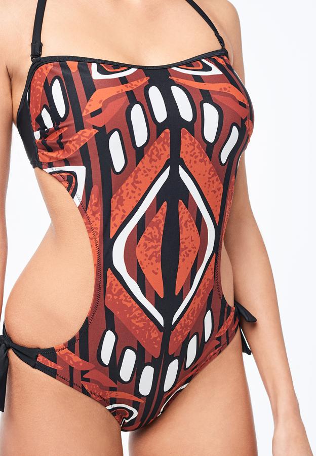 Слитный купальник из эластичного полотна с ярким принтом в этническом стиле. Мягкая чашка со съёмными формованными вкладышами и удобная пластиковая застёжка сзади. Съёмные бретели завязываются на шее. Купальник спереди на подкладке, украшен декоративными завязками на бёдрах.