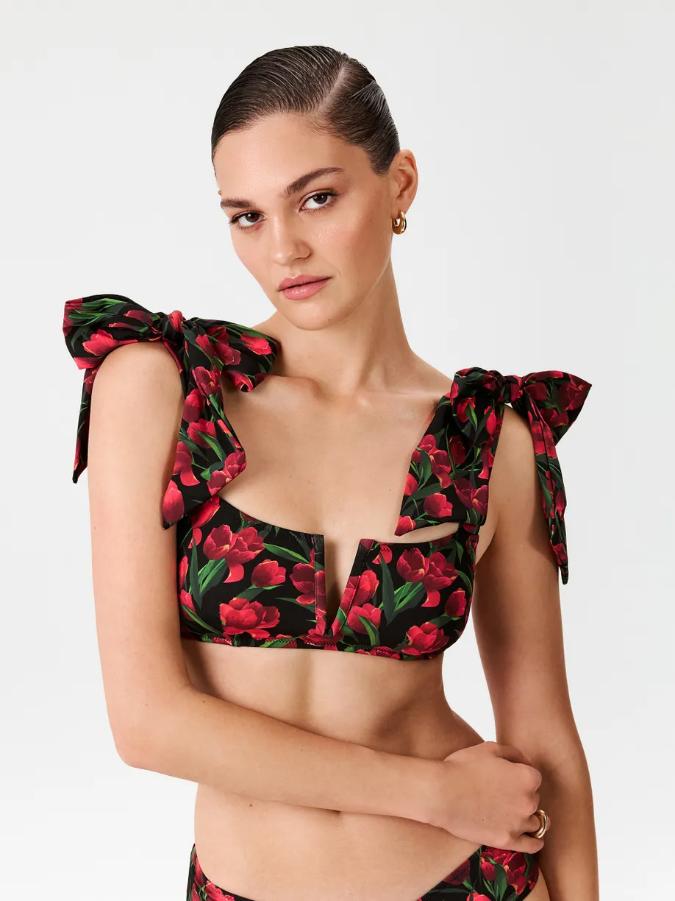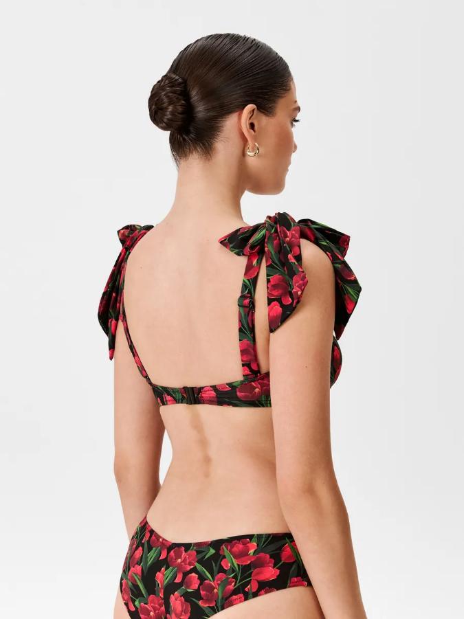 Женский купальный лиф изготовлен из эластичной ткан с принтом, которая отлично тянется и сохраняет форму. Модель с подкладкой полностью исключает просвечивание, позволяя наслаждаться отдыхом и купаниями. Лиф со съемными чашками быстро сохнет, что добавляет ему функциональности. Несъёмные бретели регулируются по длине, позволяя подогнать изделие под индивидуальные параметры. Лиф украшен несъемными декоративными бантами, придающими выразительный акцент. Перед с V-образным вырезом на каркасе смотрится стильно и необычно. На спинке расположена застежка. Черный купальный лиф украшен ярким принтом алых тюльпанов, которые создают запоминающийся пляжный образ.Дополните лиф купальными плавками из той же ткани (31204730020), чтобы собрать стильный раздельный купальник с принтом.<br />
