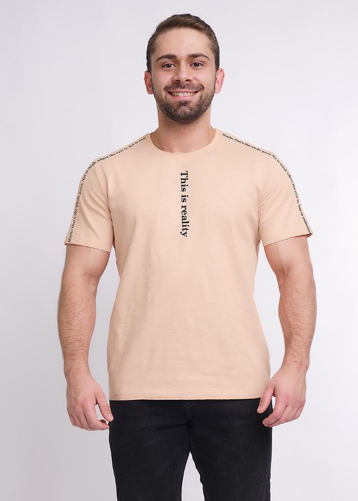 Стильная мужская футболка из флама с 100% хлопковым составом. Модель с круглым вырезом горловины и коротким рукавом, дополнена крупным текстовым принтом, что придает ей оригинальности. Изделие подойдет для активных прогулок и встреч. <br />