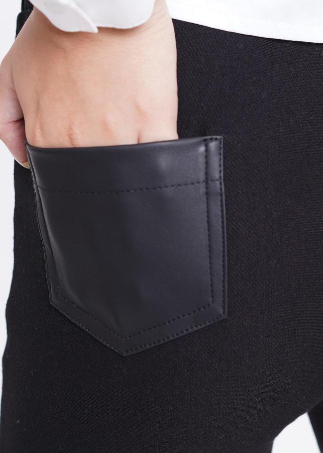 Удобные черные брюки из эластичной джинсы и иск. кожи. Модель имеет прилегающий силуэт. Удобное для использования сочетание, перед брючин и задние накладные карманы из иск. кожи, а спинка брючин и пояс из эластичной джинсы.