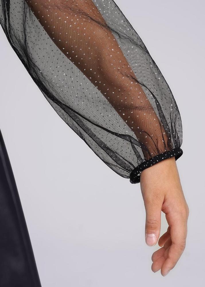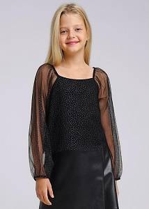 Двухслойная блузка для девочки. Рукава и верхний слой выполнены из сетки с блестящим узором, нижний слой - из хлопкового трикотажа. Поэтому ткань хорошо дышит и не вызывает дискомфорта при носке. Объемные рукава со сборкой по низу придают романтичность образу. Стильная модель подойдет для праздника, фотосессий или похода в кафе.<br />