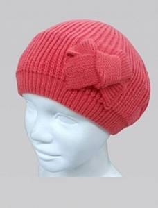 Однотонная вязанная шапка-берет для девочки с вязанным бантиком без подкладки, цвета: коралловый.<br />