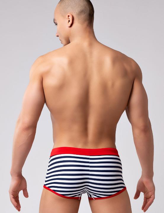Мужские плавки-боксеры из быстросохнущего эластичного полиамида, в морском стиле. Бело-синяя полоска в сочетании с ярко-красными элементами выглядит достаточно нарядно и актуально. Необычное дизайнерское решение – вертикальный красный кант по центру – даёт интересный акцент этой модели. Брендированный красный шнурок с металлическими эглетами – дополнительный модный элемент. Внутренняя конституция плавок имеет подкладку спереди и особый гульфик «puck-up», который обеспечивает комфортную посадку и выигрышный внешний вид. Внутреннюю формованную вставку при необходимости можно вынуть. Это идеальная модель как для моря, так и для бассейна. Заниженная посадка этой модели позволит получить Вам максимально красивый загар.