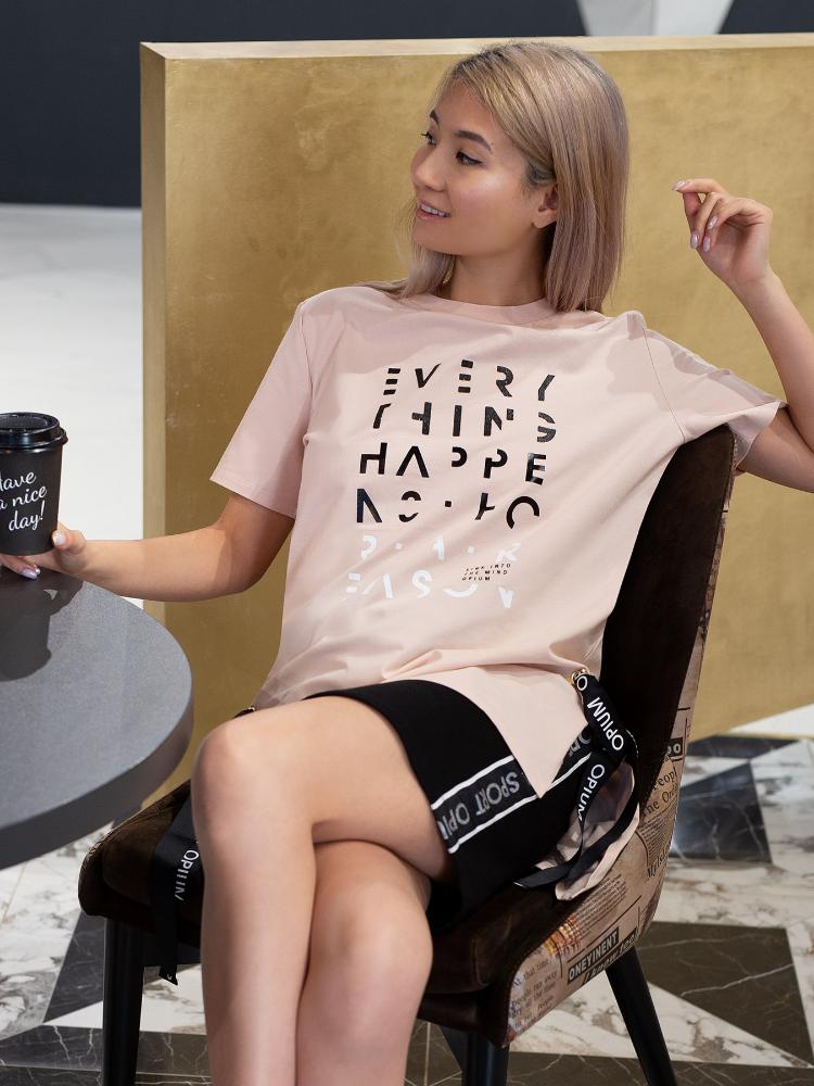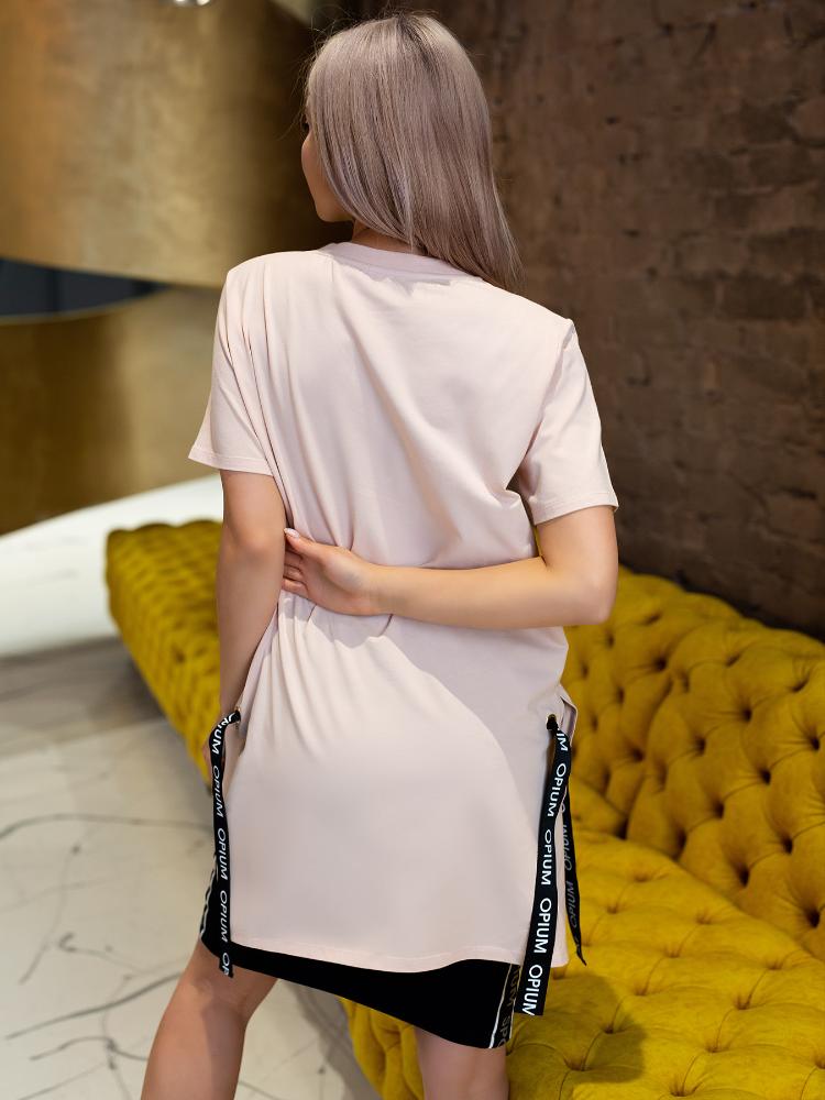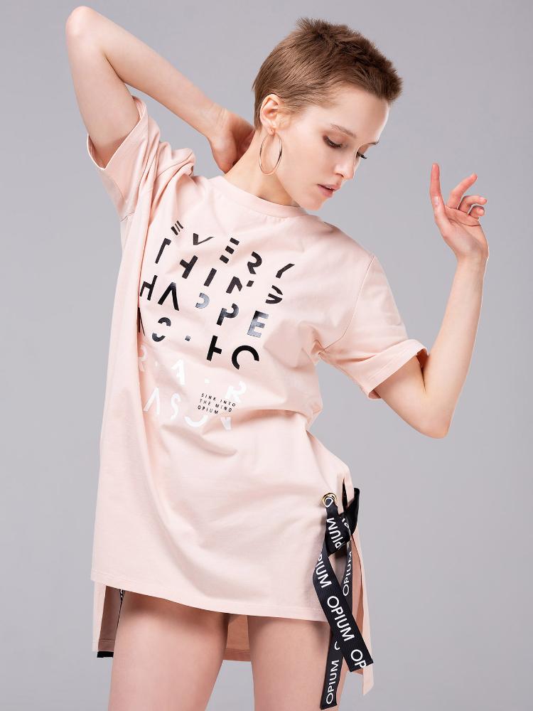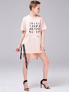 Женская футболка-туника из хлопкового трикотажа. По бокам - разрезы, которые прихватываются брендированными корсажными лентами, продетыми сквозь металлические люверсы. На груди – принт-ребус в виде английских букв, выполненных различным цветом и качеством: белые, черные, мерцающие. Футболка приятного приглушенно-розового цвета, который подойдет к любому типу кожи и освежит лицо.