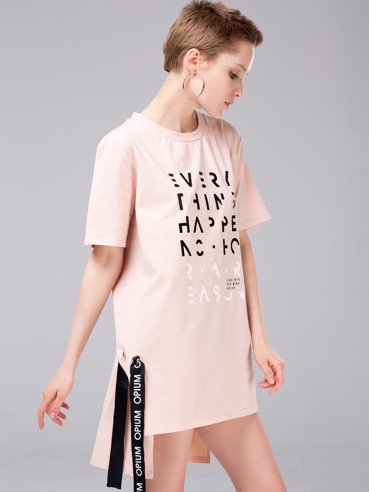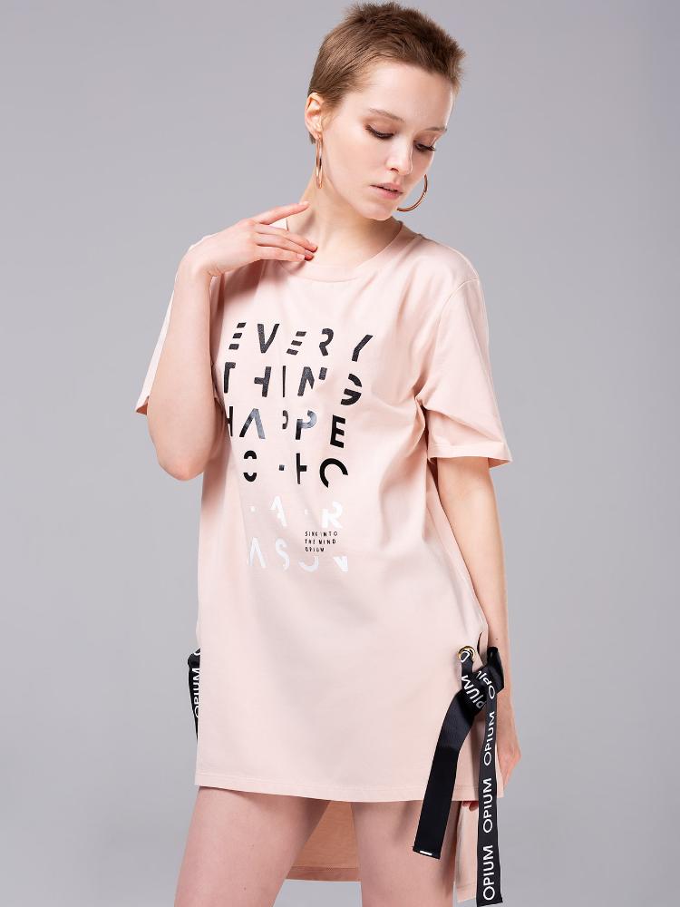 Женская футболка-туника из хлопкового трикотажа. По бокам - разрезы, которые прихватываются брендированными корсажными лентами, продетыми сквозь металлические люверсы. На груди – принт-ребус в виде английских букв, выполненных различным цветом и качеством: белые, черные, мерцающие. Футболка приятного приглушенно-розового цвета, который подойдет к любому типу кожи и освежит лицо.<br />