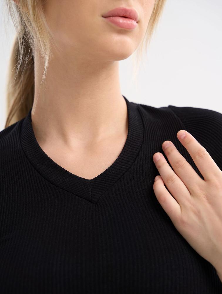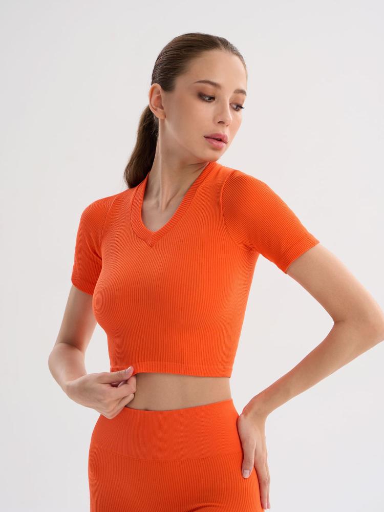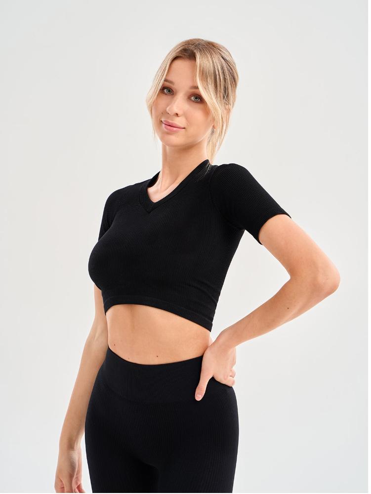Женский топ с рисунком в рубчик, с коротким рукавом и V-образным вырезом. Выполнен из мягкого трикотажного полотна с рисунком в рубчик. Специальная технология позволяет изделию идеально облегать тело, прилегающий силуэт подчеркивает фигуру