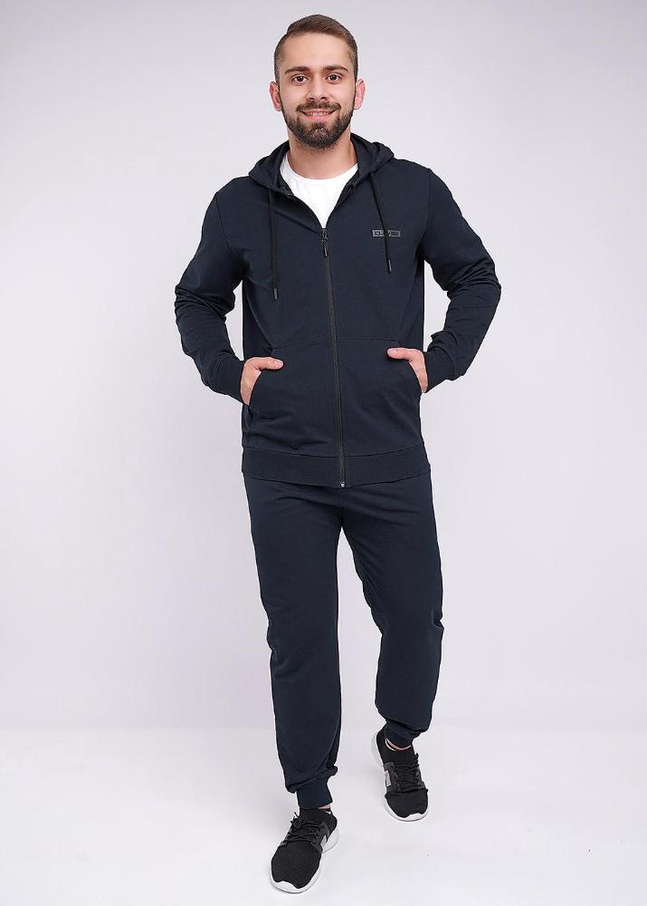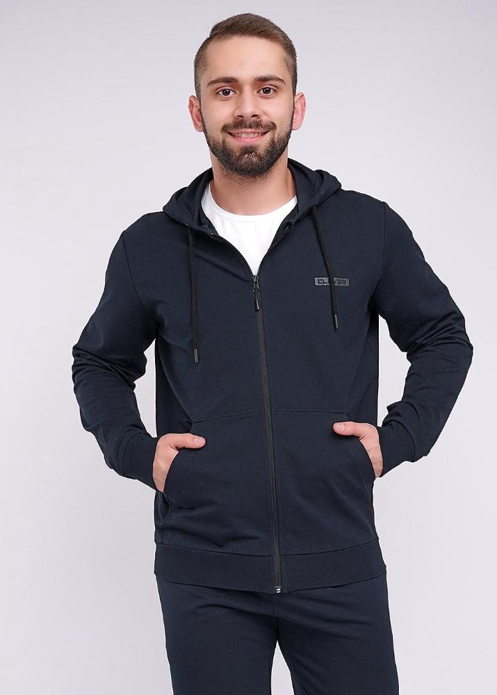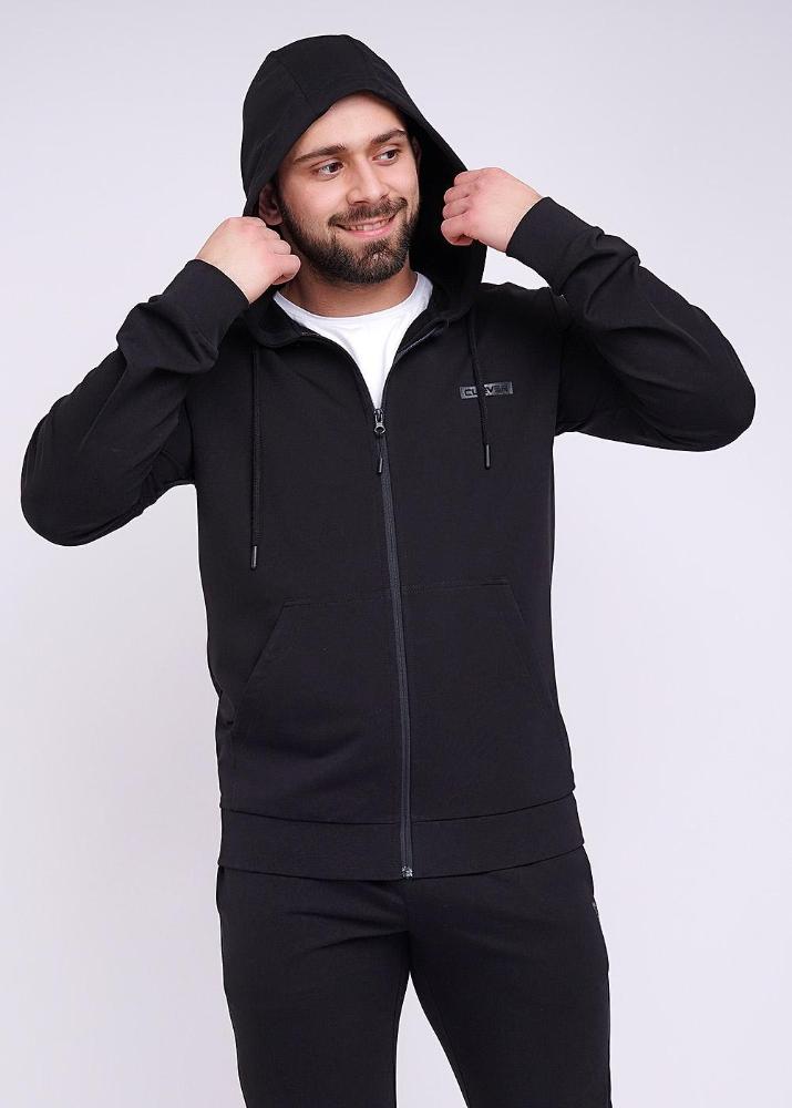 Модная куртка с капюшоном на молнии из плотного трикотажного полотна будет незаменимой вещью в гардеробе любого мужчины, благодаря функциональным карманам кенгуру и стильной отделке в виде нашивок.