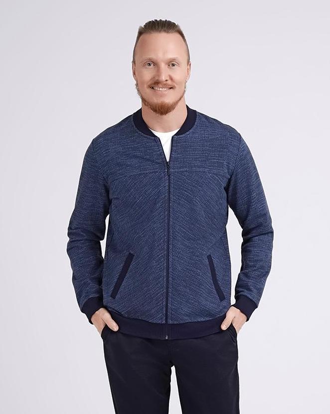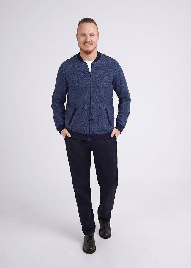 Мужской бомбер на молнии из плотного футерного трикотажного полотна с текстурным узором. Особенностью изделия являются разнонаправленные линии и фирменная фурнитура. Карманы и манжеты добавляют удобства в носке. Стильное решение для повседневного образа.<br />