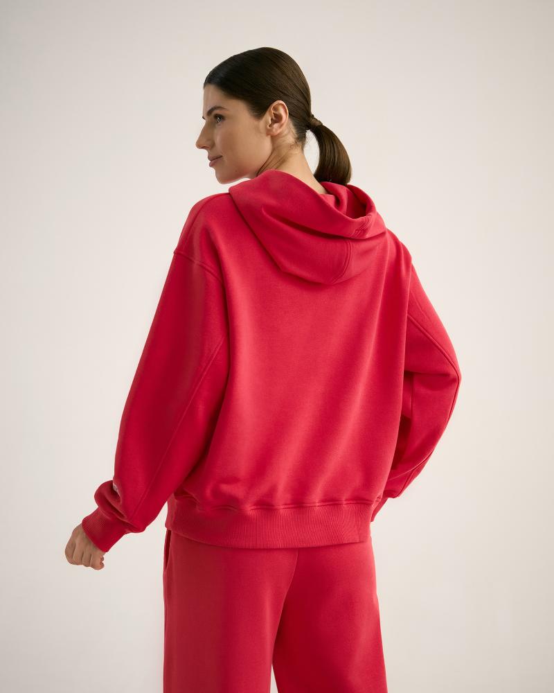 Худи женский свободного силуэта. Двойной капюшон с одним швом, притачные кокетки по переду, втачной рукав с локтевым швом. Карман "кенгуру". Манжеты и пояс из кашкорсе.