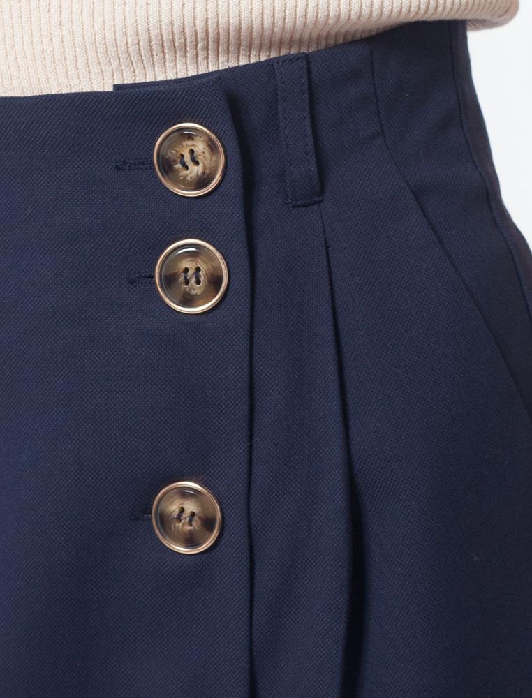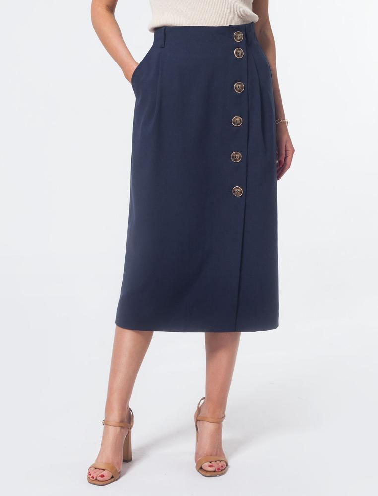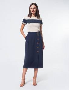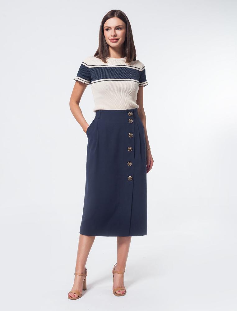 Бежевая юбка из фактурной поливискозы легко станет базовым элементом весенне-летнего гардероба. Юбка с асимметричной застежкой и карманами. Прямой крой подходит любой фигуре. Модель дополнена крупными акцентными пуговицами. Высокая посадка акцентируют талию.