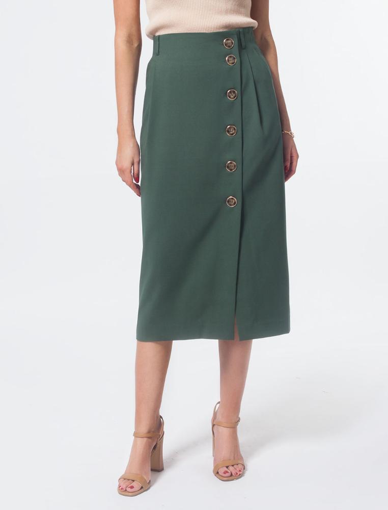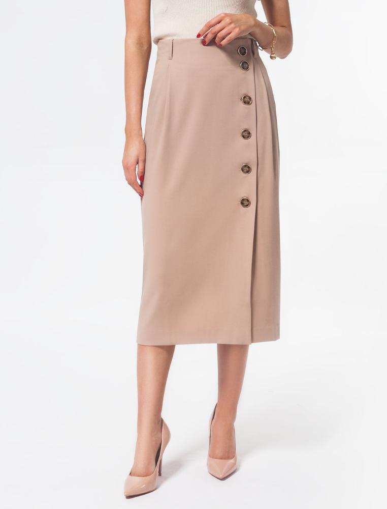 Бежевая юбка из фактурной поливискозы легко станет базовым элементом весенне-летнего гардероба. Юбка с асимметричной застежкой и карманами. Прямой крой подходит любой фигуре. Модель дополнена крупными акцентными пуговицами. Высокая посадка акцентируют талию.<br />