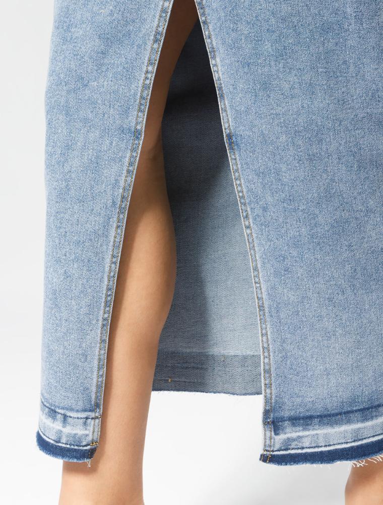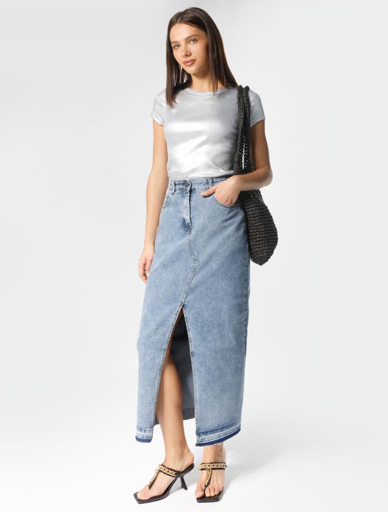 Длинная белая юбка выполнена из мягкого эластичного денима. Трендовый высокий разрез спереди добавляет чувственный характер лаконичному изделию и не сковывает шаг при ходьбе. Универсальный белый цвет сочетается с любым верхом. Подходит для любой фигуры.