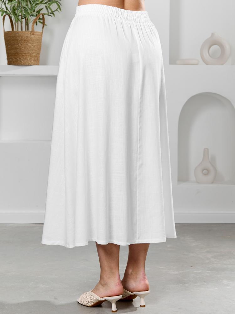 Юбка женская из гладкокрашеного тканого полотна, удлиненная, свободная, с карманами в боковых швах, на притачном поясе с эластичной тесьмой внутри.
