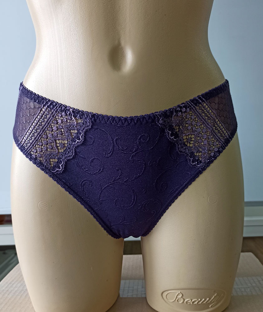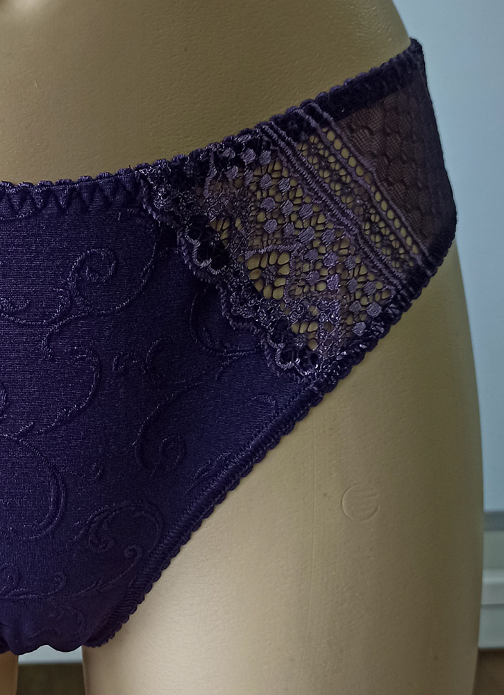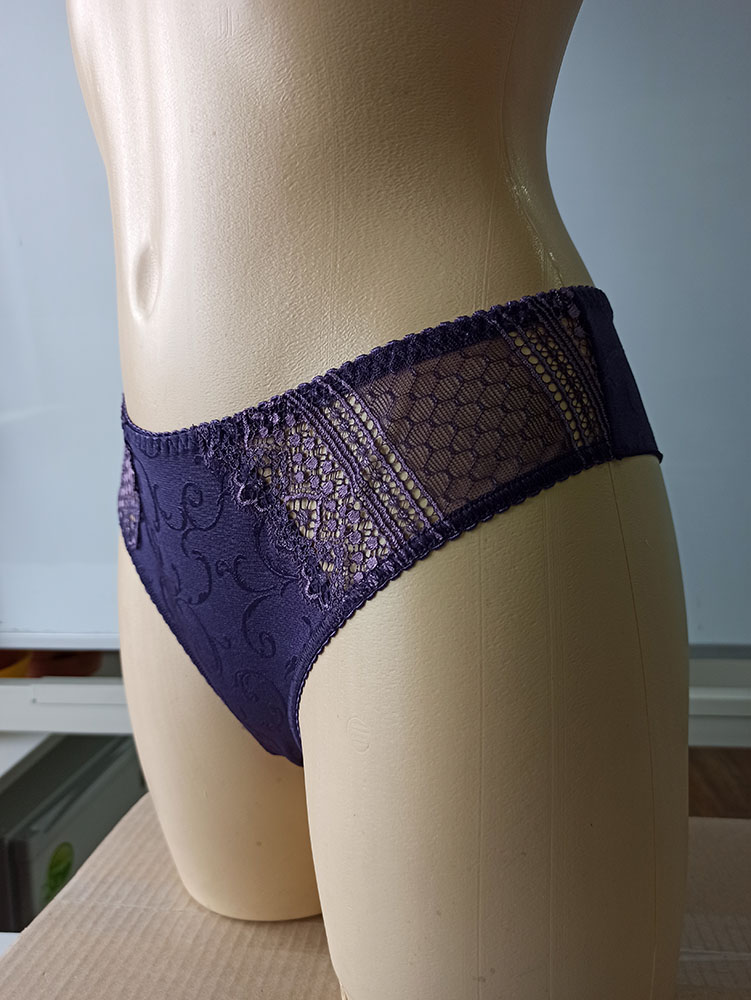 Танга с низкой линией талии. Задняя деталь обработана микрооверлоком. Боковые детали передней части - из эластичного кружева. "Ножки" обработаны мягкой эластичной лентой, подкладка ластовицы из хлопка.