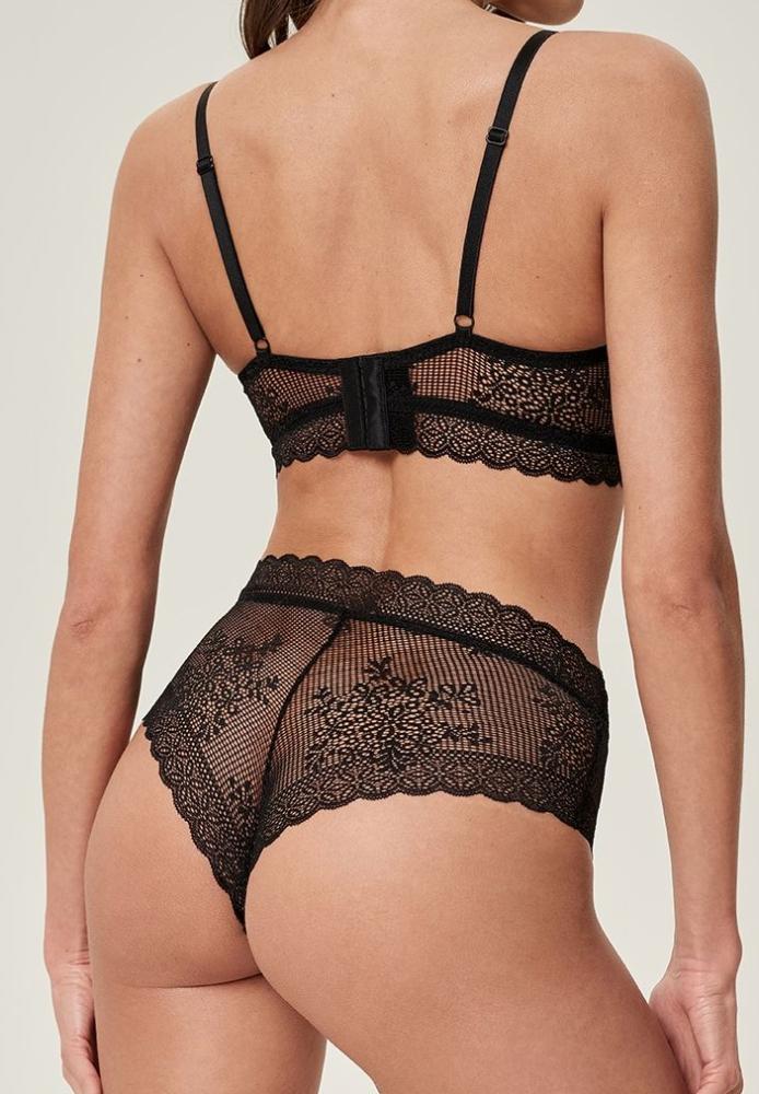 Притягательные трусики из нежной эластичной сетки с элегантным узором. Пояс и нижний край декорированы широкой кружевной лентой. Ластовица из хлопка. Изысканный и утонченный образ.