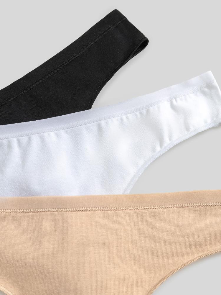 Набор из 3-х хлопковых женских стрингов. Дышащий эластичный материал прост в уходе. Удобная резинка в поясе обеспечивает комфортную посадку на любой тип фигуры. Плоские швы делают бельё почти не заметным под одеждой, а базовые цвета позволяют выбрать набор на каждый день. Наборы представлены в нескольких цветах: белом, черном или ассорти (чёрном, белом и бежевом).
