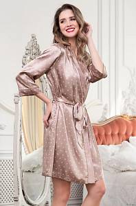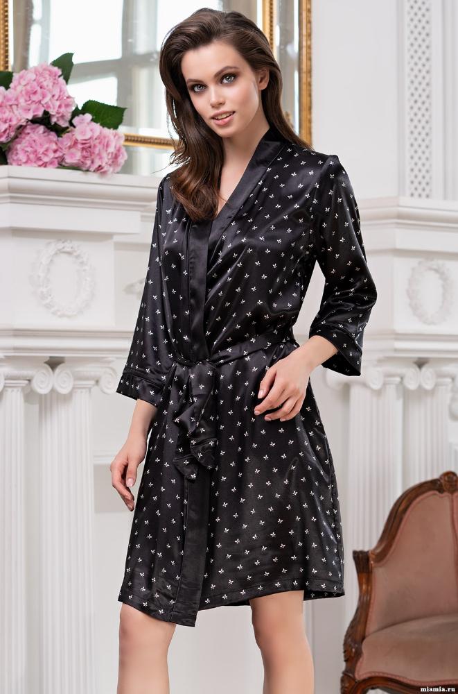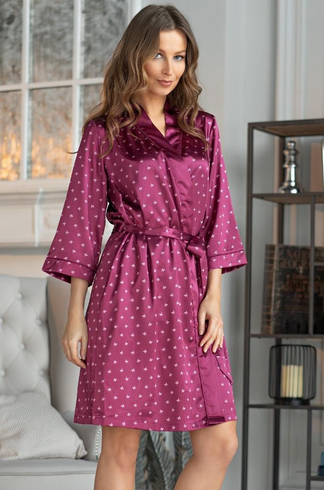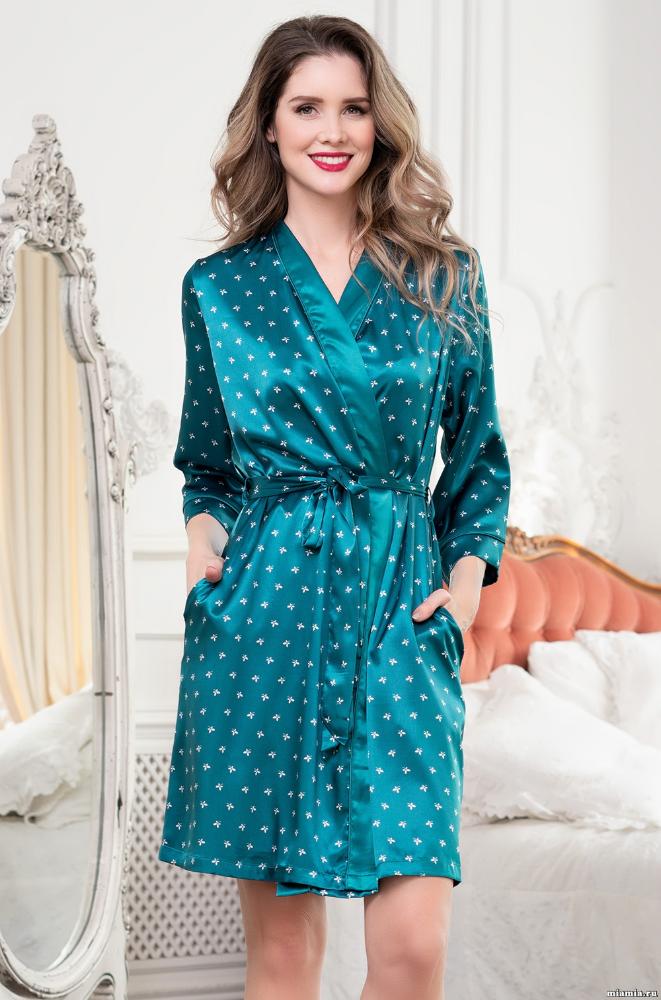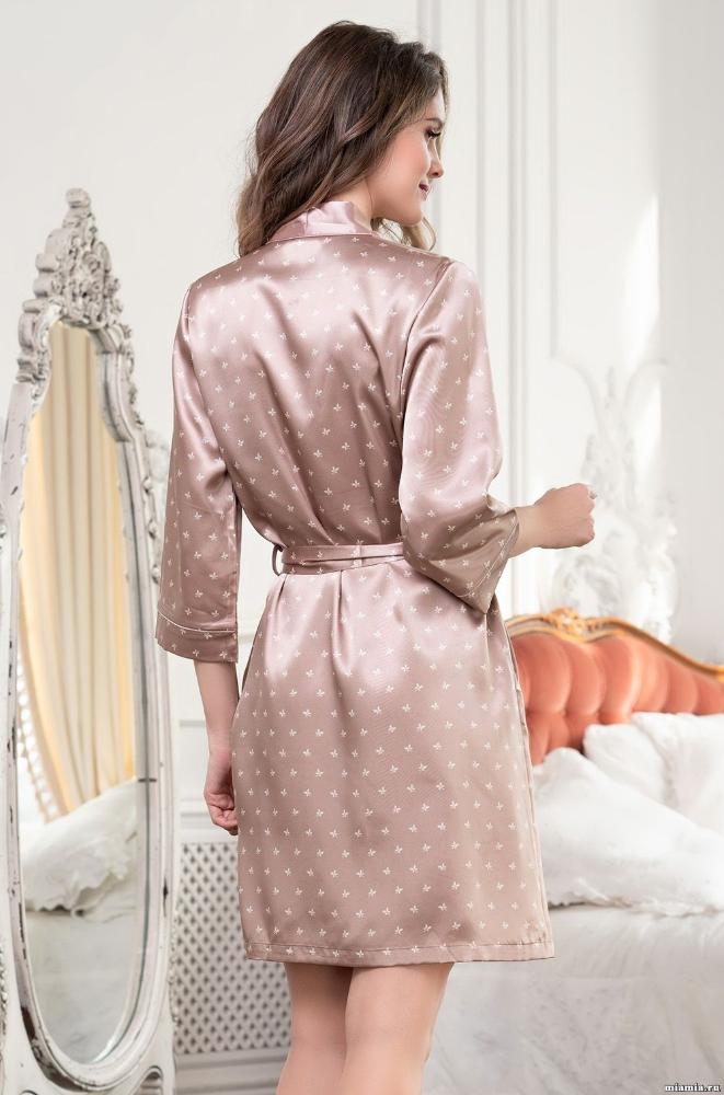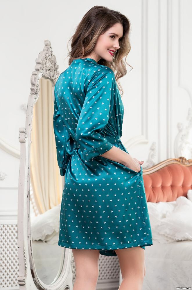Короткий халат Mia-Mella с рукавами 3/4 выполнен из принтованного искусственного шелкового полотна с атласным блеском. Рукава и борта халата декорированы однотонным кантом. Халат на запахе с поясом, в боковых швах есть карманы.