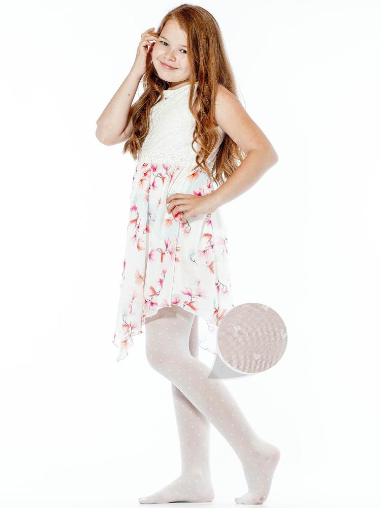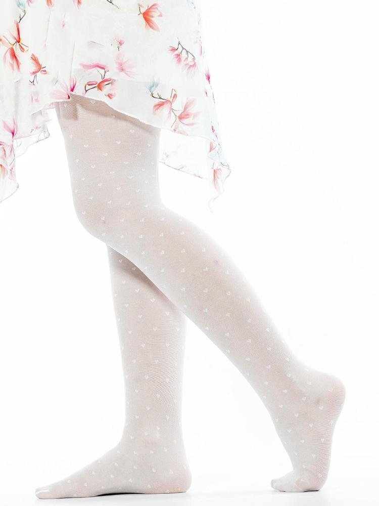Прозрачные детские колготки с оплетенным эластаном, тканый узор "сердечки", плотность 40 ден, широкий пояс, укрепленный мысок и усиленные шортики.