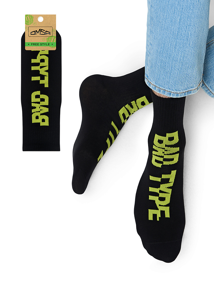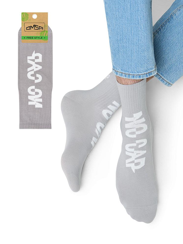 Носки OMSA FREE STYLE 600 c высокой резинкой и сленговыми надписями. В составе - высококачественный хлопок, который позволяет коже дышать, отлично впитывает влагу и подходит даже для самой чувствительной кожи. Добавление эластана обеспечивает превосходное облегание. Удобная широкая резинка и кеттельный (плоский) шов на мыске создают дополнительный комфорт.<br />