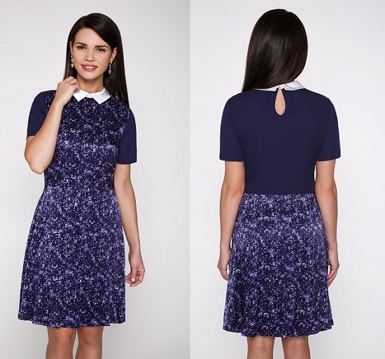 - Яркое платье приталенного кроя, декорированное цветочным принтом и классическим белым воротником.