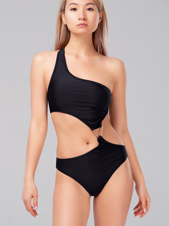 Ассиметричный купальник на одно плечо – для модных и дерзких. Смотрится стильно и не заезженно. Трусики и лиф соединяются металлическим золотым треугольником. Имеются внутренние съемные чашечки. Длина бретели регулируется. Завоевываете пляжи и отдыхайте эффектно!<br /> Состав: 80% полиамид; 20% эластан